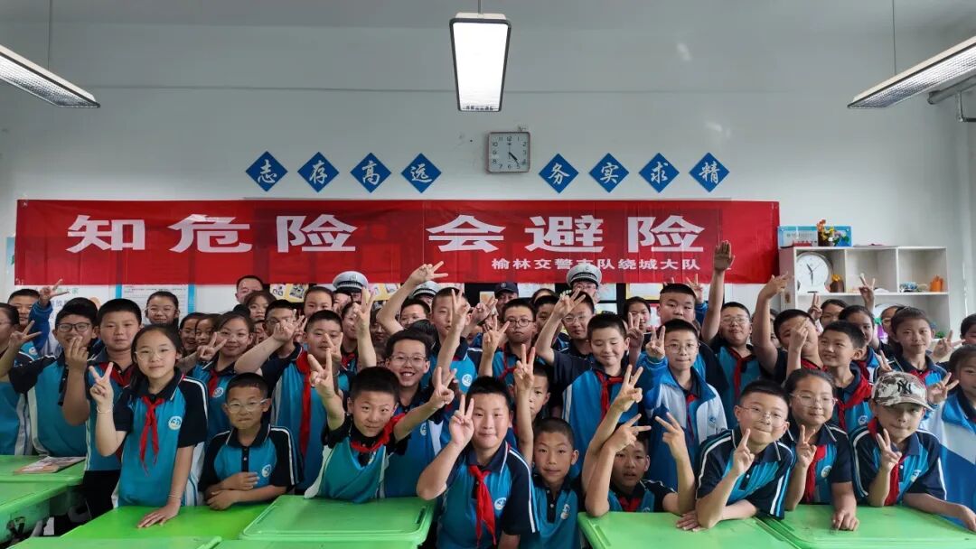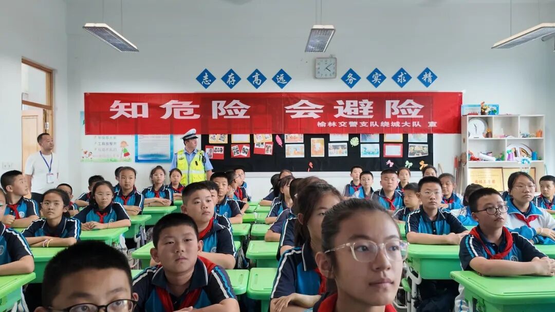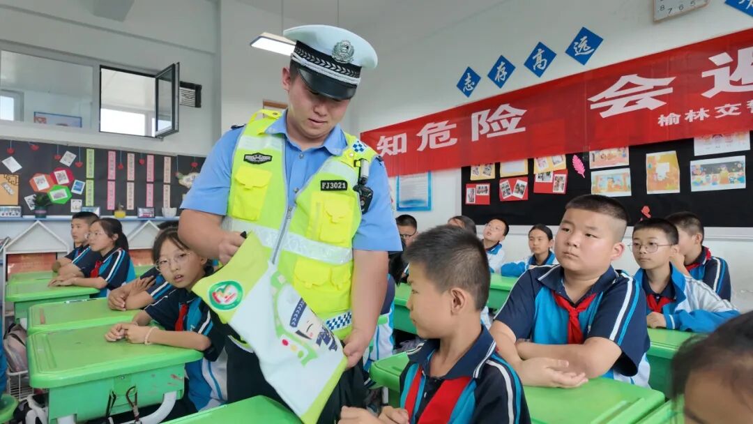 榆林公安交警高新大队组织民警进入辖区各中小学、幼儿园,通过互动问答、发放定制版《安全出行手册》和卡通贴纸等形式,教导学生牢记“一盔一带”,避开汽车盲区等交通安全知识。